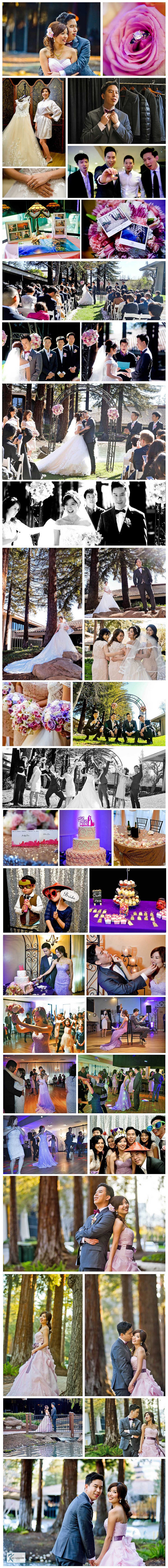 Freedom Hall and Gardens is a popular venue for weddings. Nestled right by the Great America theme park and surrounded by office buildings, the garden features a tranquil pond and giant redwood trees. Eileen and Andy got married by the pond and celebrated their wedding reception at Freedom Hall just steps away.